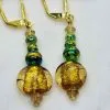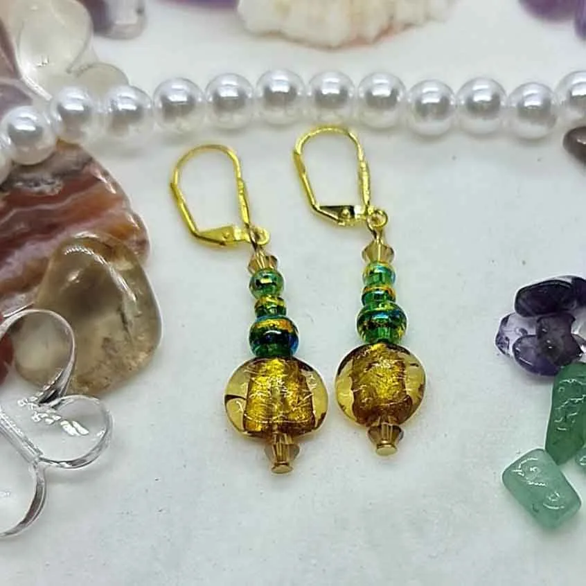 Main Bead is translucent amber with foil inset complimented by blue beads with splashes of gold, and amber crystal beads…very pretty.